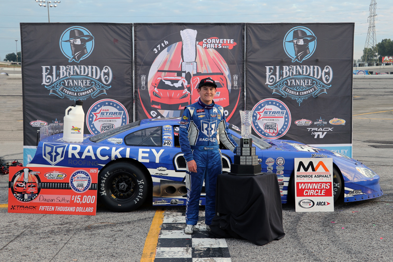 Dawson Sutton, in the Rackley Roofing sponsored #26, scored a big win in the ASA Stars National Tour sanctioned CorvetteParts.net Glass City 200 at Toledo Speedway Sept. 13. Sutton competes regularly in the NASCAR Craftsman Truck Series, but in his first visit to Toledo, the Lebanon Tennessee driver took a well deserved win over Cole Butcher #26 and Max Reaves #18